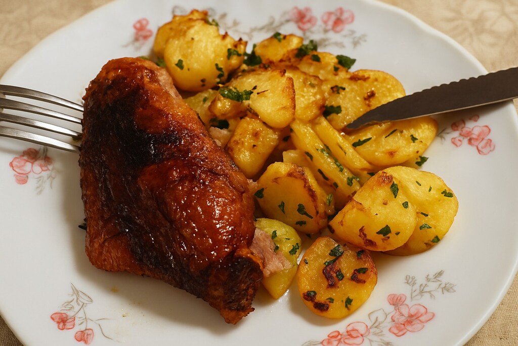 Canard rôti à l’ancienne, pommes sarladaises