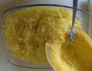 - Créez les « spaghettis » : Une fois tiédie, grattez la chair avec une fourchette pour former des filaments. Réservez.