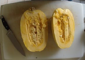 - Préparez la courge : Lavez-la, coupez-la en deux dans la longueur et retirez les graines avec une cuillère.